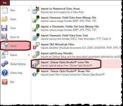 VirtualLab FusionでZemax OpticStudio®のビームファイルは次の手順でインポートすることができます。