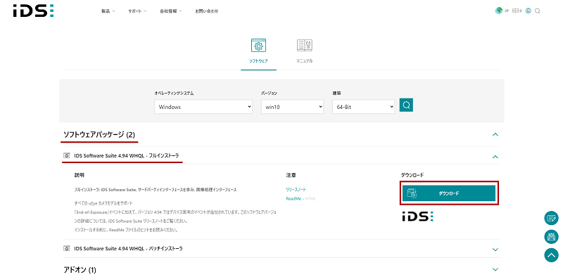 IDS社のウェブサイト(https://jp.ids-imaging.com/)のサポート項目からダウンロードを選択します。