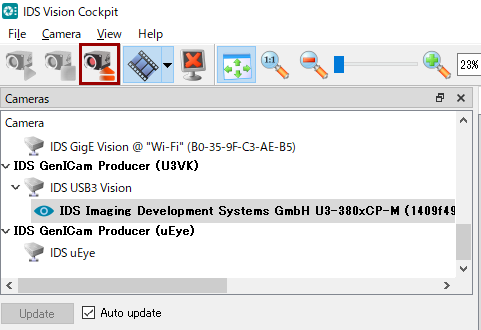 ファームウェアはカメラが接続されている状態でないとアップデートが行えないため、アップデート前にカメラが接続されていることを確認します。カメラを接続した状態で、IDS Vision CockpitのCameras欄を確認します。